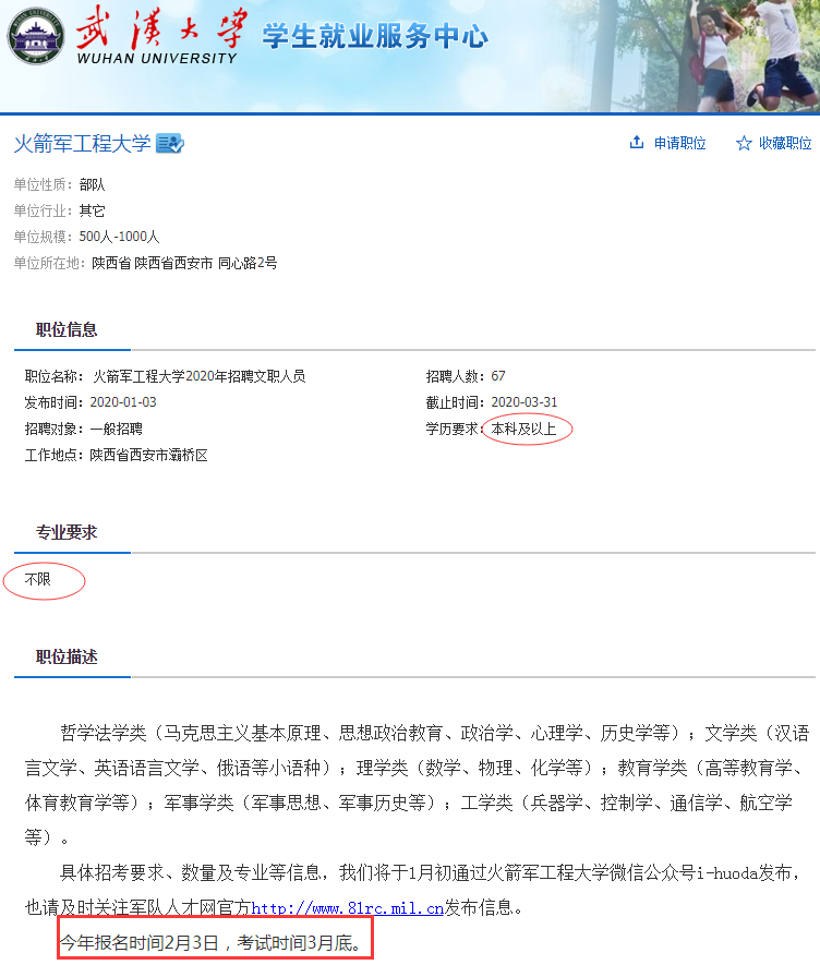 由上可知:2020年軍隊文職考試,火箭軍工程大學計劃招錄67人,本科及以上學歷可報,不限專業(yè)。按照往年報名時間推理,如果年前不發(fā)布公告,2020年軍隊文職考試可能會在1月31日發(fā)布公告,建議大家要多多關(guān)注本站,公告發(fā)布后本站會立即更新。