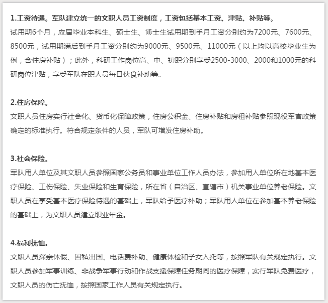 而且福利待遇趕超公務(wù)員和事業(yè)單位,在11月份,中國人民解放軍軍事科學院軍事科學信息研究中心2020軍隊文職人員招錄宣講會上就有詳細介紹。如下圖: